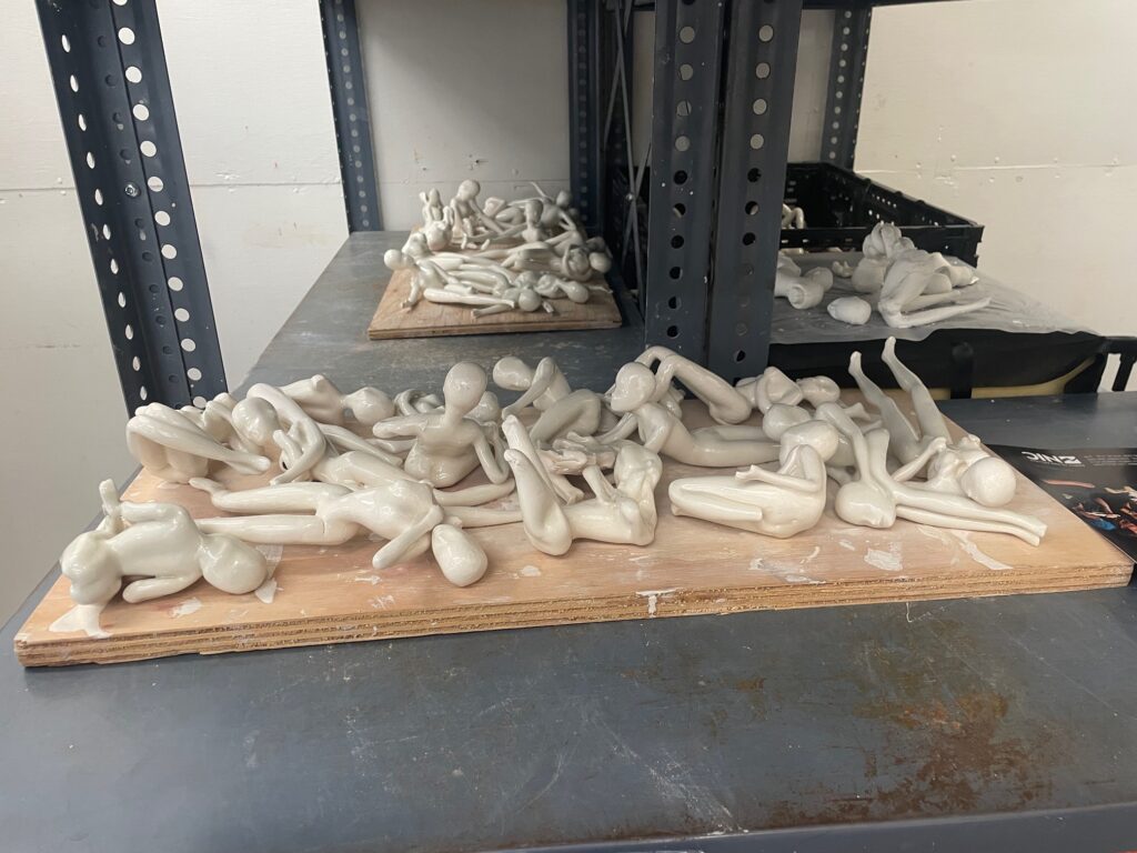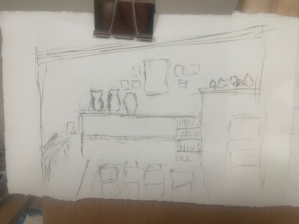 Here are the sketches made in the pottery studio. I wasn’t particularly pleased with anu of them – the pencil sketches through the window are a bit finnicky. I was quite keen on the drawing of Nim’s barbies but in the end we settled on the vases to be the one to work up for homework. The concept was to get some impression of light dark and shade