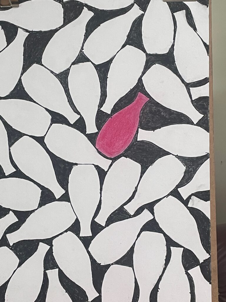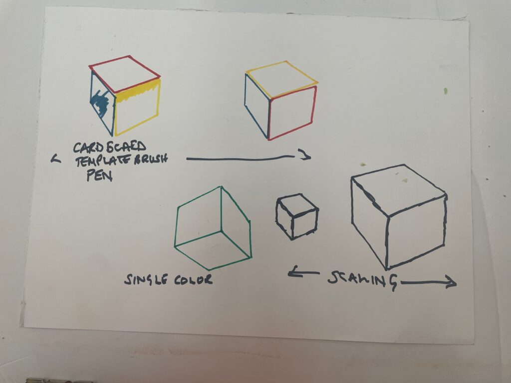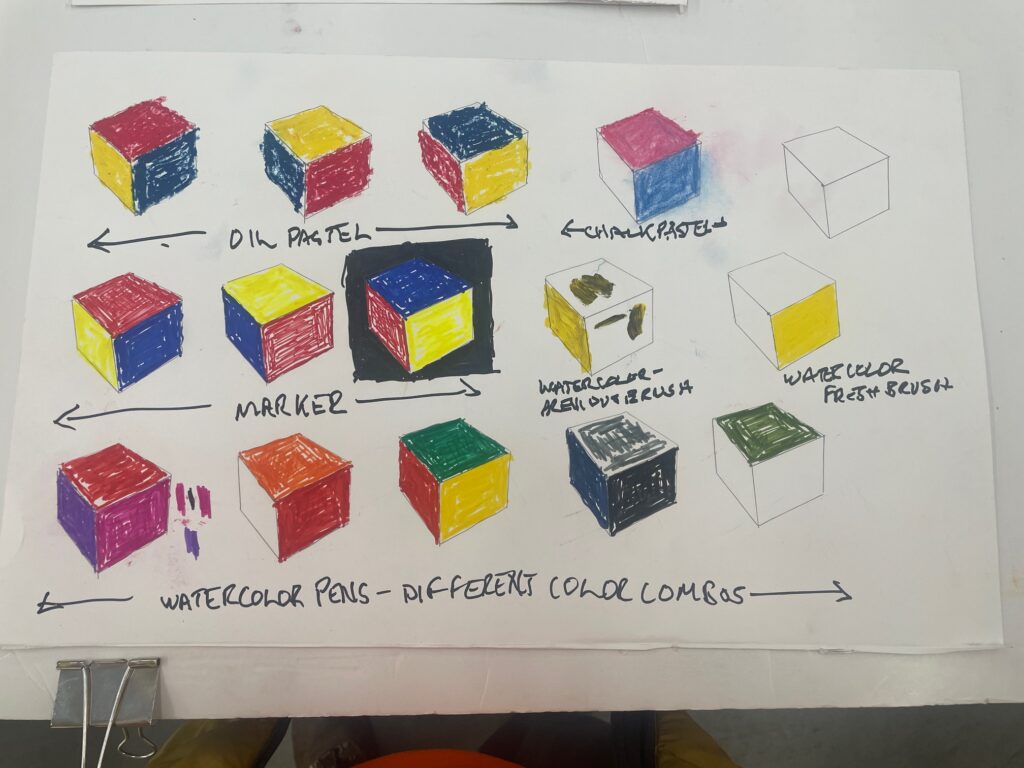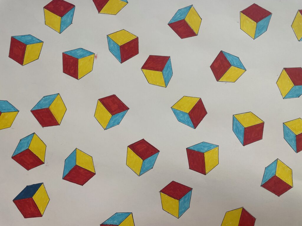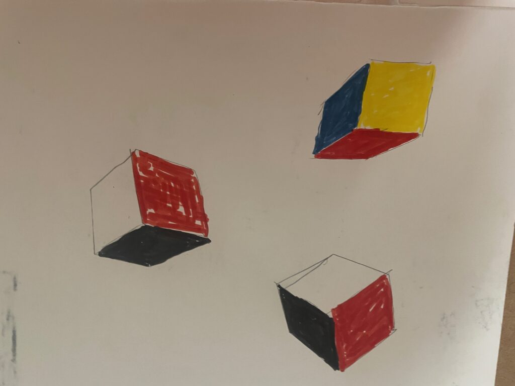 ultimately I went with the three colors – red a yellow went well, but the first blue I selected i felt was too dark and i switched to a lightere more “playground” blue. How to deal with the dark blue?? I considered cutting a light blue shape and collaging it over the dark blue, but decided that having one cube that was slightly different – like having one red vase in that drawing was better – so here we have the final project