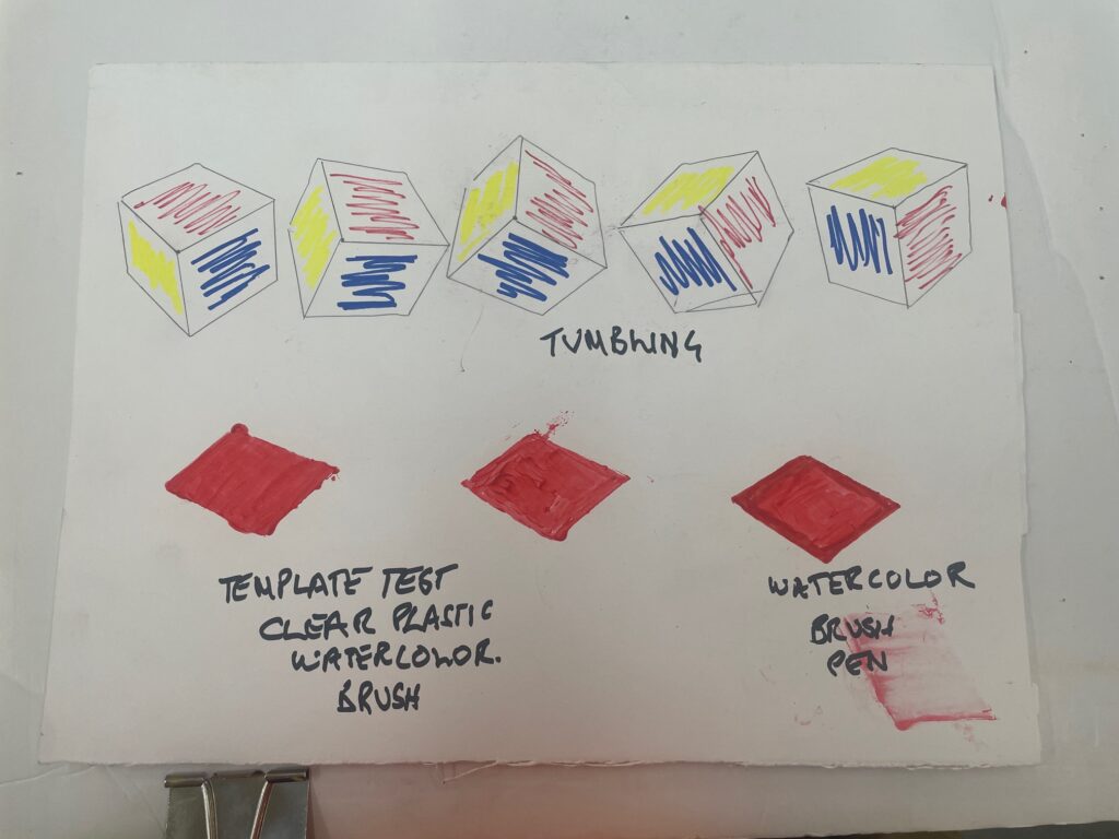 Linda and I discussed cutting cubes from one of the kin beach color washes – which I liked the idea of. Unfortunately the watercolor wash on that particular paper didn’t work at all well for cutting the shapes out which left the multiples. I was looking at using the prinary colors of the playground equipment as the kin beach element . I started with the red