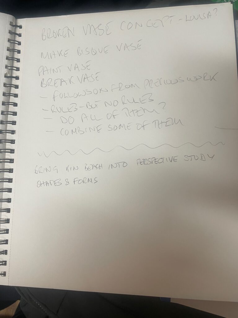 I was pretty struck with this idea straight from the get go – but we needed to also consider two other concepts. The first one was working up the drawing that I have been using for the light studies – which has been a location in kin beach which i like a lot. Perhaps try to do a really good job of working up the image – a challenge to my limited skills…The other was going back to the dreaded vases. Perhaps even making a bisque vase, drawing on it and then breaking it – perhaps more of a performance than a drawing though