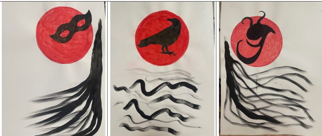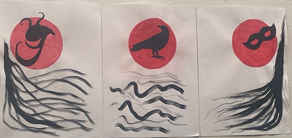 In the end I chose a triptych – the mask image on a revised watercolor background the hairstyle from the peacock skirt and a raven – the raven is not a symbol you specifically see in Beardsley’s work but it has a similar gothic feel tome of the symbols he uses